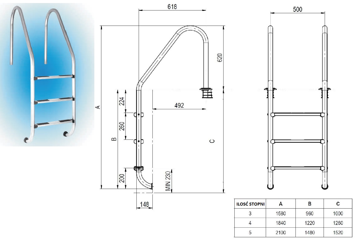 DRABINKA BASENOWA LINA TEBAS STEEL STAL NIERDZEWNA STOPNIE ANTYPOŚLIZGOWE
